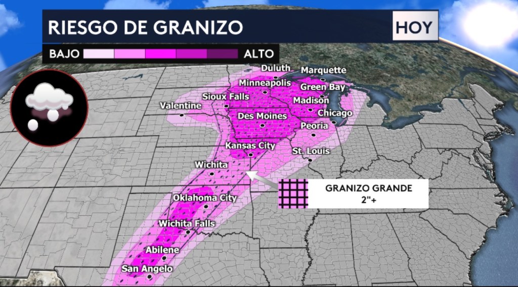 El riesgo de granizo grande de más de 2 pulgadas en diámetro (tamaño de un limón o mayor) cubre una extensa zona desde Texas hasta Wisconsin e incluye ciudades como San Angelo, Abilene y Wichita Falls en Texas; Oklahoma City en Oklahoma; Wichita y Topeka en Kansas; Kansas City en Missouri; Des Moines en Iowa; Sioux Falls en Dakota del Sur; Minneapolis y Duluth en Minnesota y Madison y Green Bay en Wisconsin.