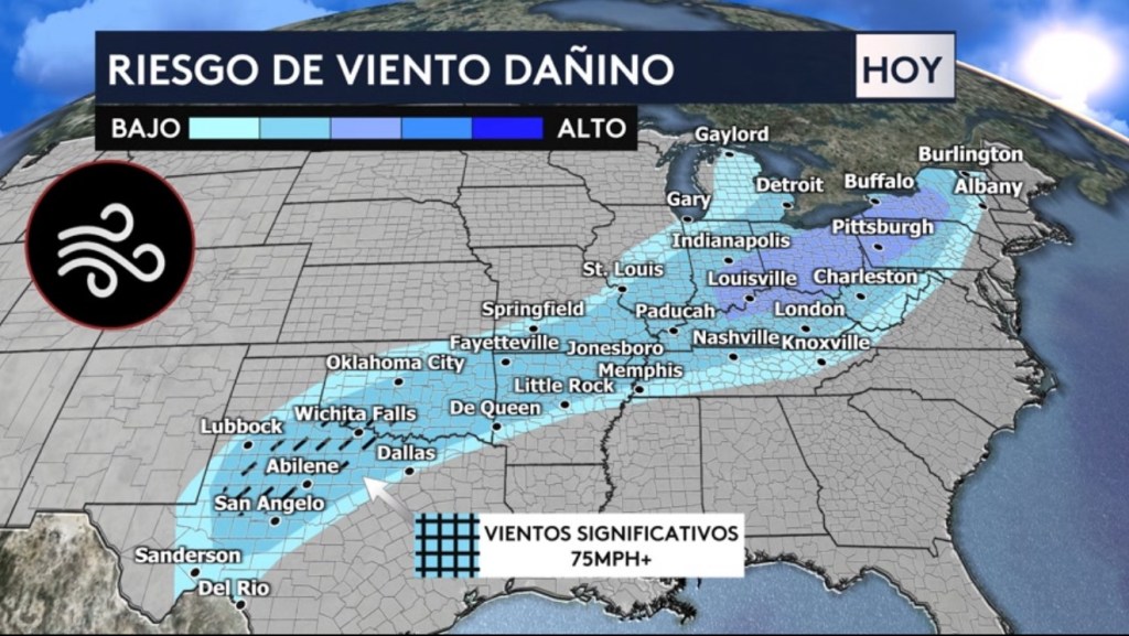 Vemos el riesgo de viento dañino hoy que se extiende desde Texas hasta Vermont. Las ciudades en la zona sombreada pudieran experimentar ráfagas de viento significativas de más de 75 mph que incluyen Wichita Falls, Abilene, Lubbock y San Angelo en Texas. Las demás ciudades fuera de esta zona sombrerada pudieran experimentar vientos dañinos de más de 58 mph.