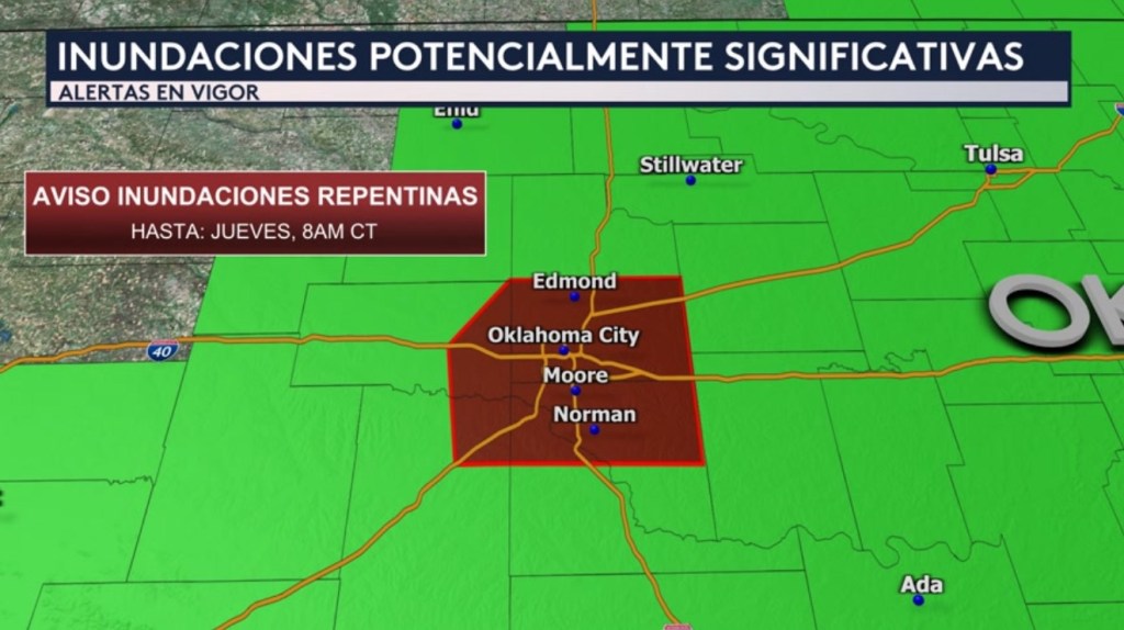 •Debido a las fuertes lluvias esta mañana en Oklahoma City, se ha emitido un aviso por inundaciones repentinas no solo ahí sino también para las ciudades en sus alrededores como Moore, Edmond y Norman hasta las 8:00AM hora central.