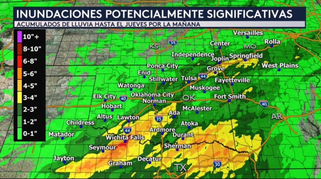•Casi el estado entero de Oklahoma y partes de Texas, Arkansas, Missouri y Kansas están bajo una vigilancia de inundaciones hasta el jueves a las 7:00AM hora central. Esto significa que las fuertes lluvias que están pronosticadas pudieran causar inundaciones dentro de este período. La vigilancia de inundaciones incluye ciudades como Oklahoma City, Lawton, Wichita Falls, Graham, Decatur, Childress, Mcalester, Ada, Tulsa, Fort Smith, Fayetteville, Joplin y Springfield.