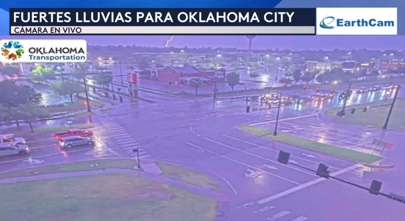 •¡Vemos una cámara de tráfico en vivo desde Oklahoma City en Oklahoma donde estamos observando descargas eléctricas y fuerte actividad de lluvia!