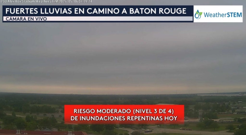 •Empezamos con una cámara en vivo desde la ciudad de Baton Rouge en Louisiana, donde hoy están bajo un riesgo moderado (nivel 3 de 4 en la escala de inundaciones) de inundaciones repentinas.