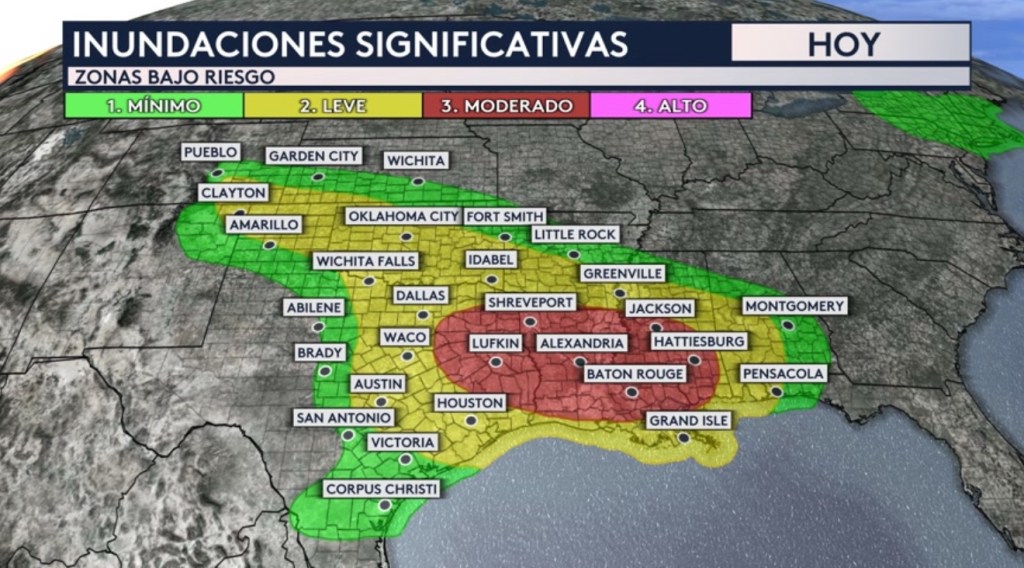 •Un frente cálido subiendo al norte sobre la zona hoy estará trayendo fuerte actividad de lluvia donde habrá un riesgo moderado de inundaciones repentinas no solo para la ciudad de Baton Rouge sino también para Nueva Orleans, Jackson, Hattiesburg, Alexandria, Shreveport y Lufkin. Las inundaciones aquí pudieran ser significativas hoy.