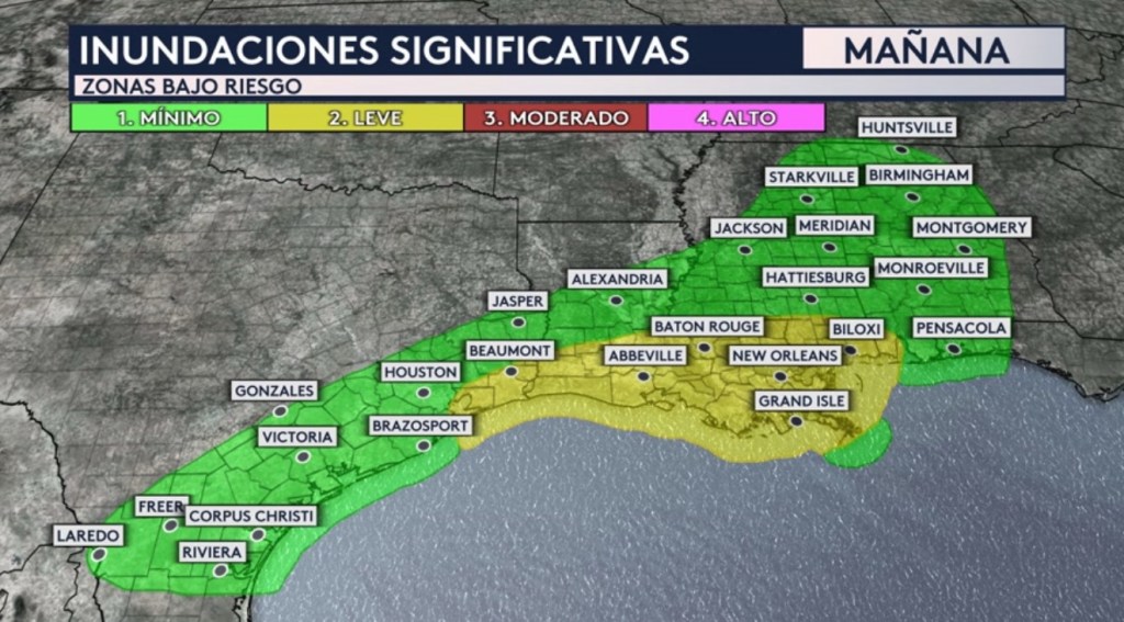 El riesgo de inundaciones no será tan alto para el miércoles, pero todavía tendremos un riesgo leve (nivel 2 de 4 en la escala) en vigor a lo largo de la costa del golfo desde el sureste de Texas hasta Alabama. La emisión de un riesgo más alto para el día de mañana depende en la cantidad de lluvia que cae hoy sobre esta misma zona bajo riesgo mañana.
