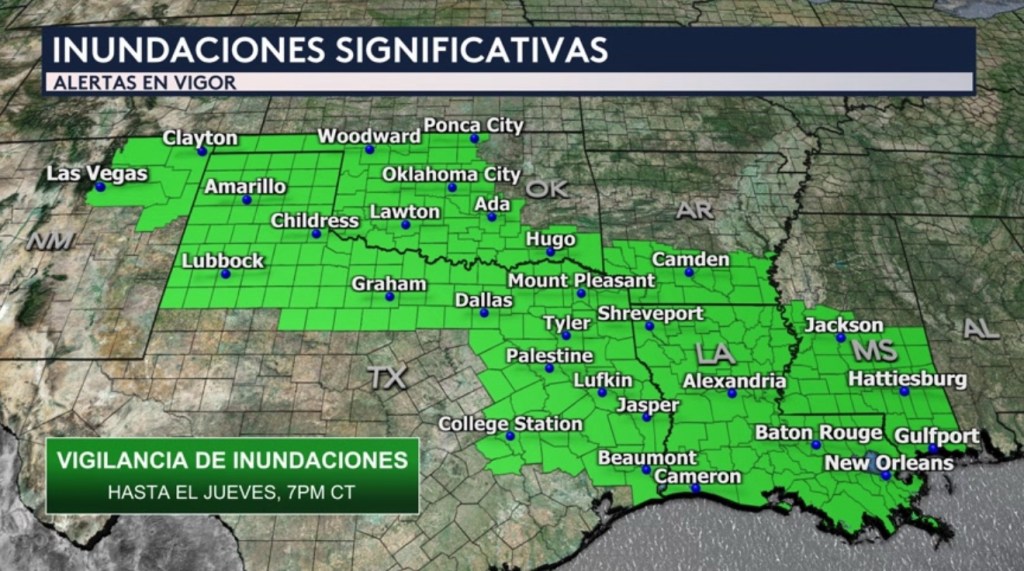 •Debido a estas fuertes lluvias, hay una vigilancia de inundaciones en vigor desde Nuevo México hasta Mississippi hasta el jueves a las 7:00PM hora central. Incluye ciudades como Las Vegas y Clayton en Nuevo México; Amarillo, Lubbock, Dallas, Tyler, College Station y Beaumont en Texas; Oklahoma City, Lawton y Hugo en Oklahoma; Shreveport, Alexandria, Baton Rouge y New Orleans en Louisiana; Camden en Arkansas; y Jackson y Hattiesburg en Mississippi.