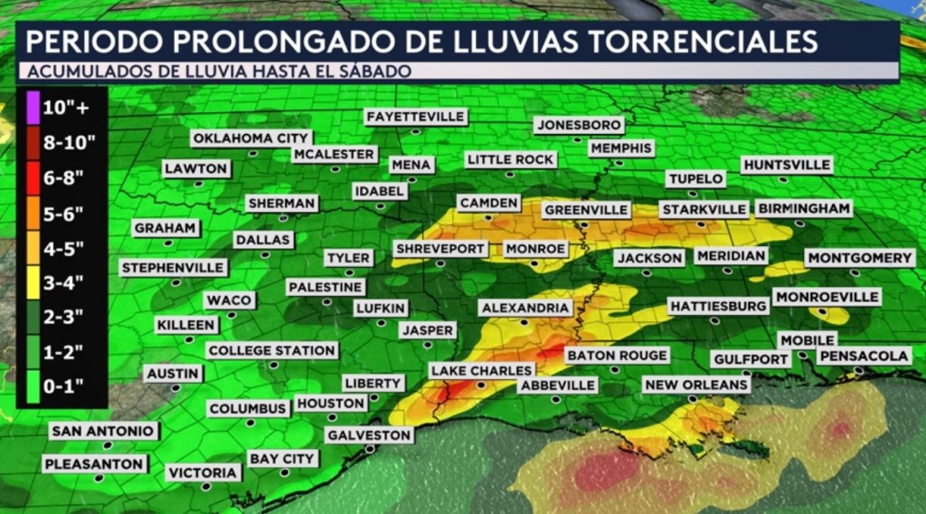 •Pero no solo estaremos vigilando las fuertes lluvias hasta el jueves sino para un período más prolongado hasta al menos el sábado. Nuestro modelo de pronóstico muestra hasta 8 pulgadas entre hoy y el sábado por la mañana sobre el sureste de Texas y el sur de Louisiana. Hasta 6 pulgadas de lluvia serán posibles hacia el norte de Louisiana, sur de Arkansas y norte de Mississippi.