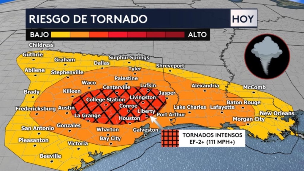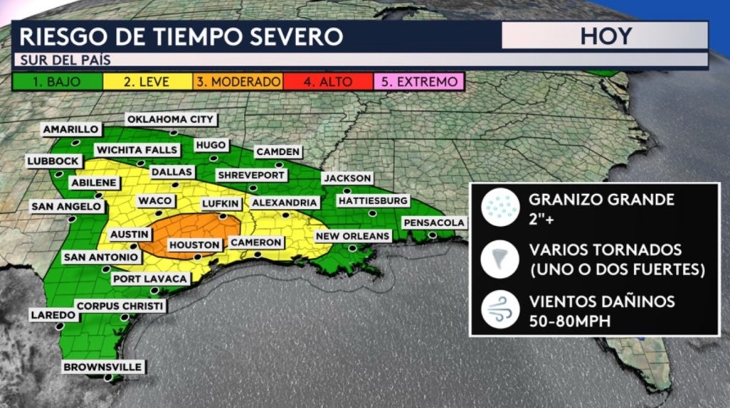 Estaremos vigilando muy de cerca el riesgo de tiempo severo hoy que se extiende desde Texas hasta el panhandle de Florida. Pero en la sombra naranja que representa un riesgo moderado (nivel 3 de 5 en la escala de severidad) es donde habrá el riesgo más alto de día de tornados (algunos de ellos pudieran ser fuertes). Esto incluye las zonas justamente al norte del área metropolitana de Houston y ciudades como College Station, Conroe, Bryan, Lufkin, The Woodlands y Temple.