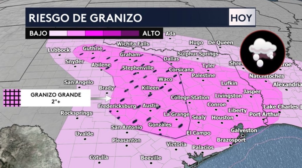 Vemos también el riesgo de granizo con más detalle. Se pronostica granizo de gran tamaño de más de 2 pulgadas en diámetro (más grande que un limón) para el centro de Texas y ciudades como Waco, Stephenville, Killeen, Austin, La Grange, Gonzales y Fredericksburg. No se descarta este granizo de gran tamaño un poco más al este de esta zona marcada por el Centro de Predicción de Tormentas hacia el este de Texas que incluye el área metropolitana de Houston.