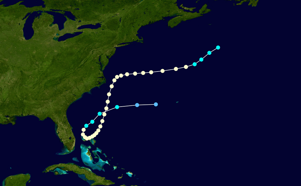 •Por último el huracán Able a sido el más fuerte desde que se tiene registro fuera de la temporada de huracanes en el Atlántico. El primer ciclón tropical de la temporada de huracanes en el Atlántico de 1951, Able, se desarrolló a partir de una depresión el 15 de mayo aproximadamente a 480 km al sur de Bermudas. Siendo inicialmente un ciclón subtropical, Able se convirtió en su totalidad en tropical, al moverse sobre las tibias aguas de la corriente del Golfo, y alcanzó la Categoría de Huracán el 17 de mayo cerca de la costa de Florida. Giró al sureste y de nuevo hacia el este gracias a una corriente cercana a las Bahamas, esto antes de que tomara rumbo norte. El 22 de mayo Able alcanzó su registro más alto con vientos máximos de 150 km/h a 115 km de Cabo Hatteras en Carolina del Norte. El huracán se debilitó al dar vuelta al este, convirtiéndose en un ciclón extratropical el 23 de mayo.