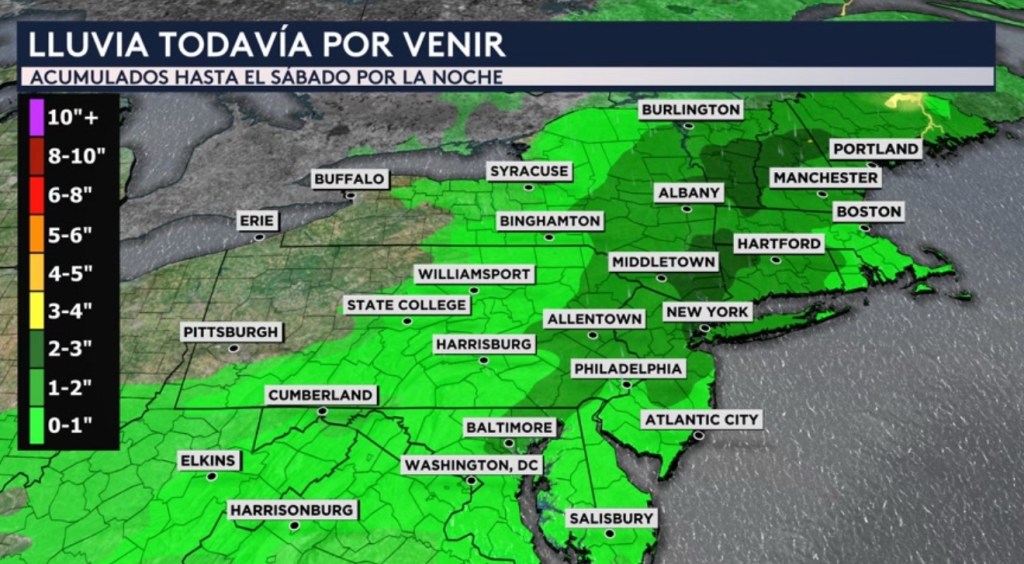 Una nueva ronda de lluvia llega al noreste y a ciudades como Nueva York, Philadelphia, Baltimore y Washington DC a partir del jueves por la noche. Las lluvias se pondrán más intensas el viernes por la noche para ciudades como Philadelphia, Nueva York y Boston donde las inundaciones empezarán a ser una preocupación.