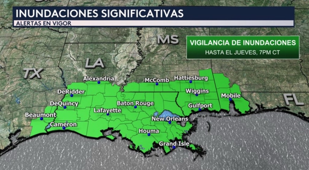 •Debido a las fuertes lluvias que todavía se esperan hasta el jueves por la noche, sigue en vigor una vigilancia de inundaciones para partes de Texas, Louisiana, Mississippi y Alabama. Incluye ciudades como Beaumont en Texas; New Orleans, Baton Rouge, Lafayette, Alexandria y Cameron en Louisiana; Mccomb, Hattiesburg y Gulfport en Mississippi y Mobile en Alabama.