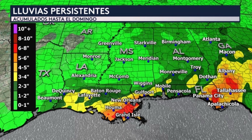 •Pero las precipitaciones no solo estarán presentes hasta el jueves por la noche sino hasta después que la vigilancia de inundaciones se expire. Con las lluvias persistiendo a lo largo de la costa del golfo hasta el fin de semana, nuestro modelo de pronóstico muestra más de 6 pulgadas de acumulados para el sureste de Louisiana y tanto en el panhandle de Florida como el sur de Georgia. Estos acumulados son válidos hasta el domingo por la noche.
