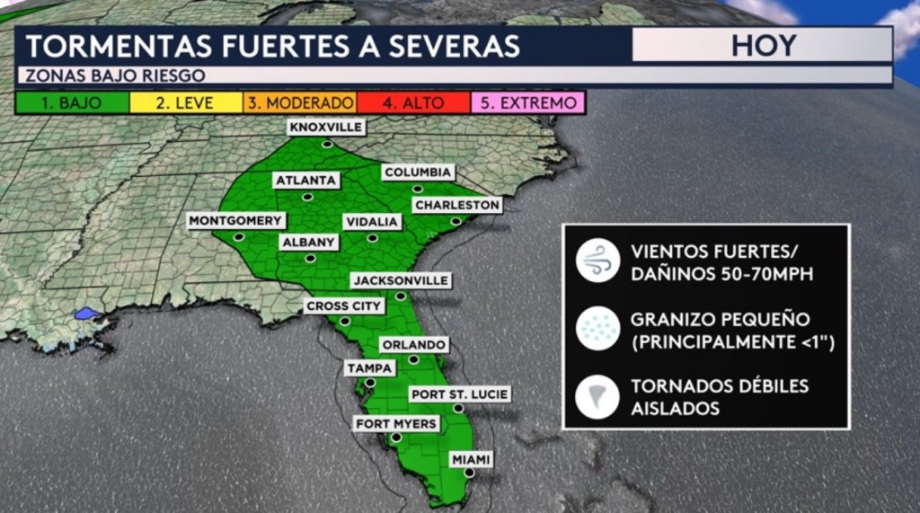 •Además de estas fuertes lluvias también estaremos vigilando el riesgo de tiempo severo a través del sureste del país. Dentro de algunos de estos aguaceros tropicales habrá tormentas eléctricas que se pudieran convertir fuertes a severas. La mayor amenaza con estas tormentas serán vientos fuertes a dañinos de entre 50 a 70 mph. Granizo pequeño (principalmente inferior a una pulgada en diámetro) y tornados débiles aislados también serán posibles. Las ciudades que se encuentran bajo este riesgo hoy son Miami, Fort Myers, Tampa, Orlando, Jacksonville, Atlanta, Savannah, Montgomery, Charleston y Knoxville.