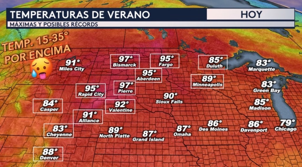 •Las temperaturas máximas se mantendrán por encima del promedio hasta mediados de semana hacía el norte de país. Chicago estará casi llegando a los 80° tanto hoy como el miércoles. Las máximas en ciudades como Bismarck en Dakota del Norte, Pierre en Dakota del Sur y Marquette en la península superior de Michigan estarán entre 20 a 35° por encima del promedio hoy y mañana con un alivio en camino a partir del miércoles.