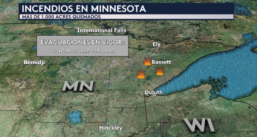 •Estamos vigilando a tres incendios que están quemando más de 1.000 acres al norte del estado de Minnesota justamente al norte de la ciudad de Duluth en el condado St. Louis. El incendio más grande en este momento se llama Jenkins Creek y ha quemando aproximadamente 6.000 acres justamente al oeste de la ciudad de Bassett. Tanto este incendio como el Incendio Camp House que se encuentra al sur de la ciudad de Bassett han provocado órdenes de evacuación en los condados St. Louis y Lake.