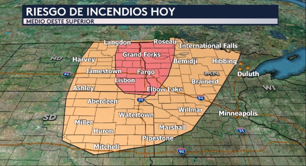 •Los condiciones atmosféricas seguirán soportando la propagación de tanto estos incendios como nuevos incendios que se inicien hoy debido a los bajos niveles de humedad y los fuertes vientos del sureste. Hay riesgos elevados y críticos (niveles 1 y 2 de 3 en la escala de incendios, respectivamente) en los colores anaranjados y rojos para los estados de Dakota del Norte, Dakota del Sur y Minnesota. Ciudades como Fargo y Grand Forks en Dakota del Norte y Roseau en Minnesota están bajo ese riesgo crítico.