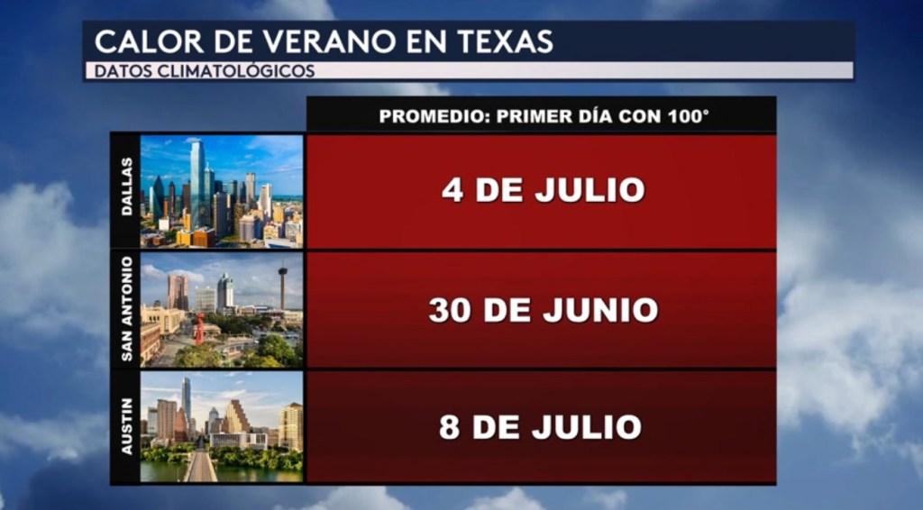 •Si vemos a los datos climatológicos, las ciudades de Dallas y Austin normalmente no tienen su primer día del año con 100° sino hasta el mes de julio, ¡entonces estamos casi dos meses adelantados! San Antonio normalmente no ve su primer día con 100° sino hasta el 30 de junio.