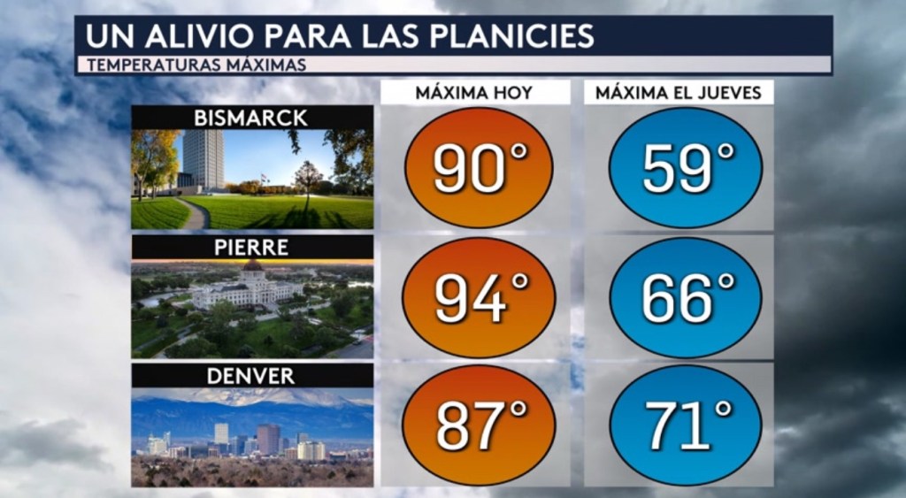 •Otro sector del país donde hemos visto este calor fuera de temporada en los últimas días es el norte de las planicies. Esto incluye las ciudades de Bismarck en Dakota del Norte, Pierre en Dakota del Sur y Denver en Colorado que seguirán observando temperaturas máximas de hasta 25° por encima del promedio hoy. Pero viene un alivio a partir del jueves detrás de un frente frío, ¡donde estas máximas estarán bajando por más de 25° en cuestión de días! Bismarck estará en el rango de los 50° el jueves y Pierre en los 60°.