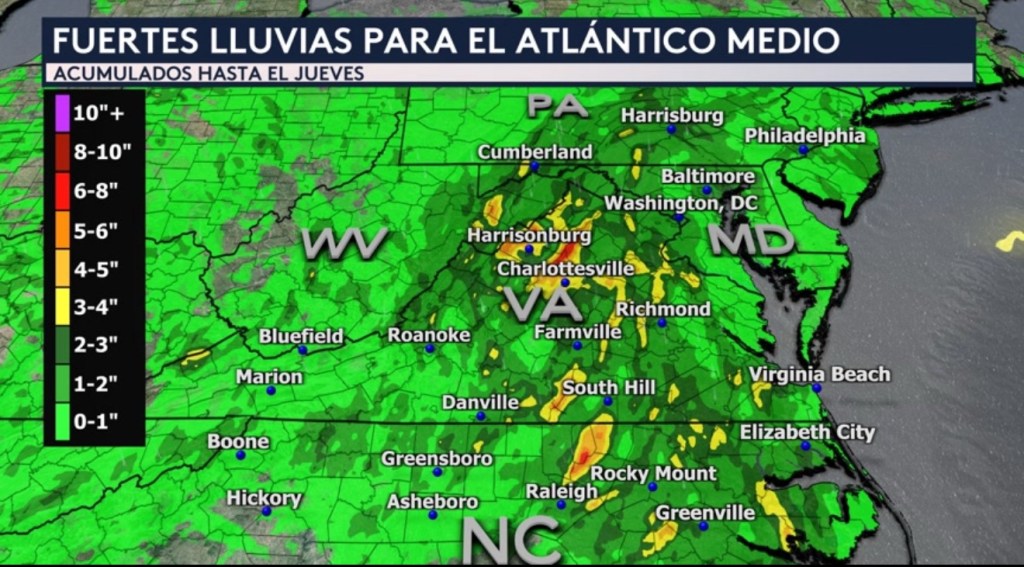 •Nuestro modelo de pronóstico muestra acumulados aislados de lluvia de más de 6 pulgadas en las Montañas Blue Ridge en los Apalaches del estado de Virginia justamente al norte de la ciudad de Charlottesville. Tendremos acumulados generalizados de 1 a 2 pulgadas desde Carolina del Norte hasta Pennsylvania hasta el jueves por la mañana. Zonas aisladas pudieran recibir entre 3 a 5 pulgadas.