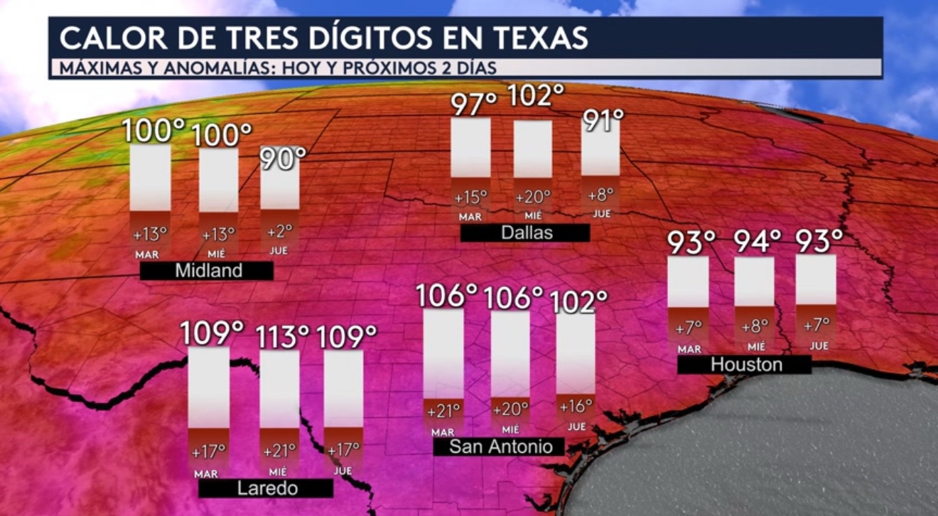 •Las temperaturas máximas subirán rápidamente entre hoy y el jueves. Houston estará en el rango de los 90° mientras que ciudades como San Antonio, Laredo y Midland experimentarán los tres dígitos. ¡Laredo llegará a los 112° mañana!