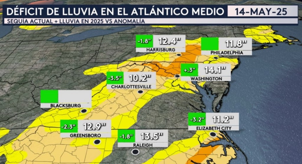 •Los estados del Atlántico Medio siguen lidiando con una sequía de baja a extrema. Las ciudades de Raleigh, Greensboro, Charlottesville y Harrisburg todos están por debajo del promedio con respecto a la cantidad de lluvia que han recibido este año. Aunque es bien ligero, Washington DC tiene una acumulación de lluvia hasta la fecha por encima del promedio de solo 3 décimas de pulgada.