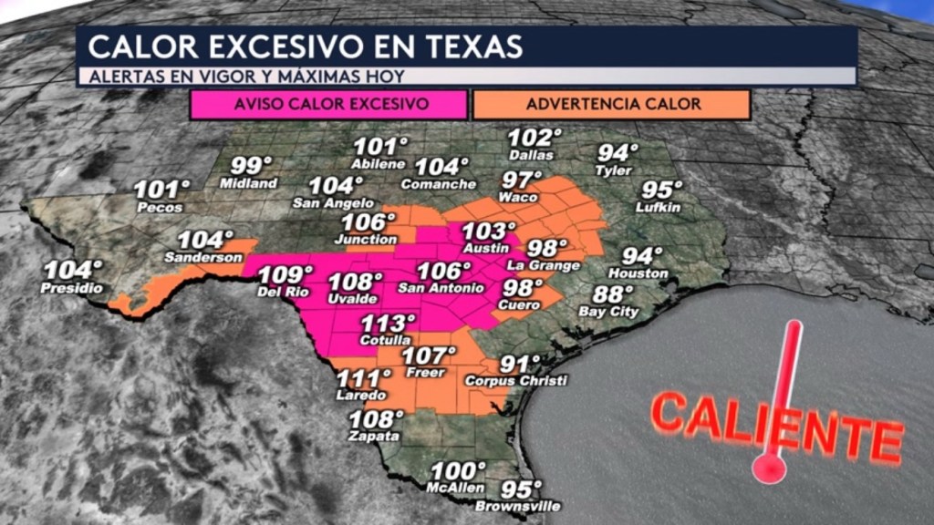 Hay advertencias por calor en vigor para ciudades como La Grange, Cuero, Laredo, Freer, Junction, Sanderson y Waco. Hay avisos por calor excesivo para ciudades como Austin, San Antonio, Uvalde y Del Río.