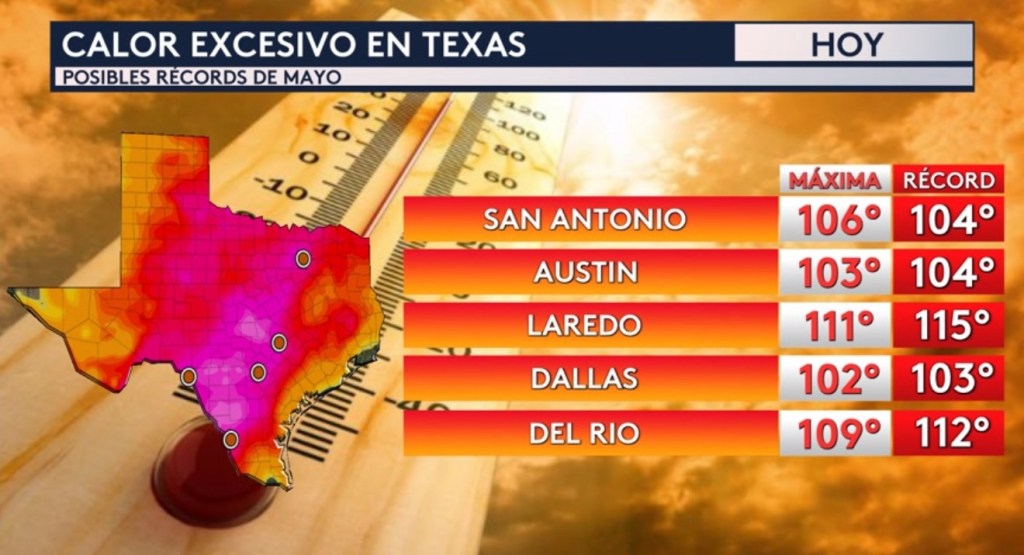 •¡No solo estaremos posiblemente batiendo récords diarios de temperatura máxima en Texas hoy sino también los de mayo! La temperatura más caliente jamás registrada en el mes de mayo en la ciudad de San Antonio fue 104°. ¡Hoy se pronostica que la ciudad llegue a los 106°! Ciudades también como Austin, Dallas, Laredo y Del Río estarán muy cerca a sus récords del mes.