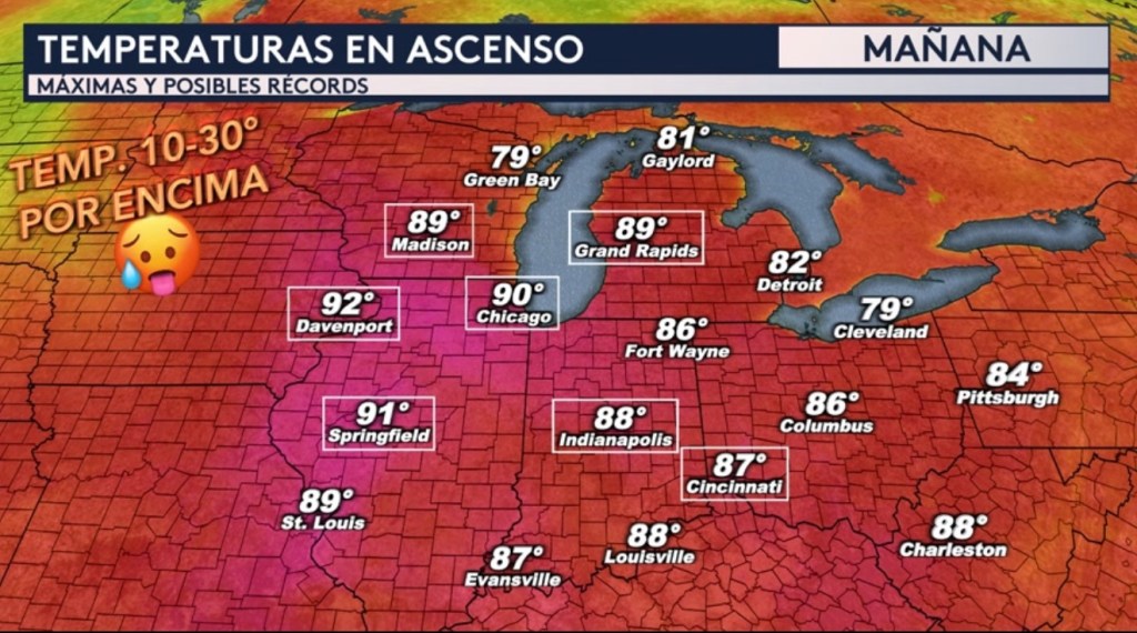 •El calor de verano se estará desarrollando a través del Medio Oeste, Grandes Lagos y Valle de Ohio a partir de mañana. ¡Ciudades como Chicago, Davenport y Springfield estarán llegando a los 90°! Estas ciudades además de las ciudades de Madison en Wisconsin, Grand Rapids en Michigan, Indianapolis en Indiana y Cincinnati en Ohio pudieran batir un récord diario. Pittsburgh, Charleston, Columbus, Fort Wayne, Detroit, Gaylord, Louisville y Evansville todos estarán en el rango de los 80°. Estas máximas serán entre 10 a 30° por encima del promedio para esta época del año.