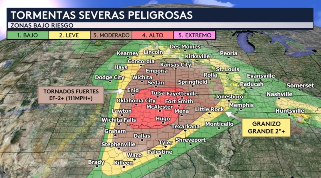 •No estaremos vigilando esta actividad de lluvia y tormentas para el riesgo potencialmente significativo de tiempo severo hoy sino una segunda ronda de precipitaciones que se estarán formando durante las horas del calentamiento del día. Tendremos nuevamente un riesgo moderado (nivel 4 de 5 en la escala de severidad) en vigor hoy, esta vez para los estados de Oklahoma, Texas, Arkansas, Missouri y Kansas. Incluye ciudades como Oklahoma City, Tulsa, McAlester y Hugo en Oklahoma y Fayetteville y Fort Smith en Arkansas.