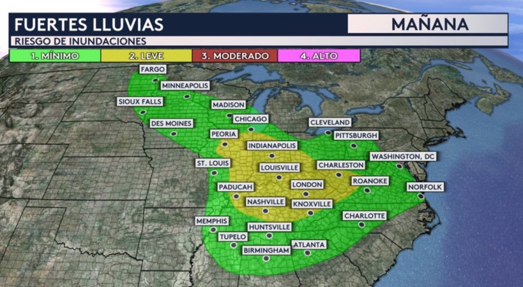Para mañana, estas fuertes lluvias se desplazan al este, poniendo a una estrecha zona desde Dakota del Norte hasta Virginia bajo el riesgo de inundaciones repentinas.