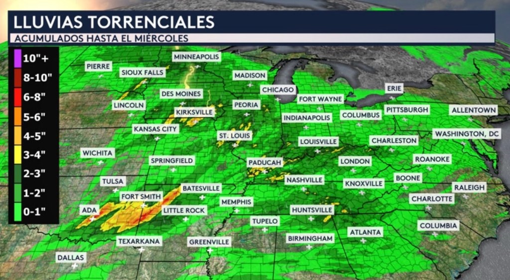 Hay un riesgo leve de nivel 2 de 4 en la escala de inundaciones para ciudades como Des Moines en Iowa; Peoria en Illinois; Kansas City, San Luis y Springfield en Missouri; Paducah en Kentucky; Jonesboro y Little Rock en Arkansas y Hugo en Oklahoma.