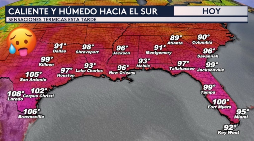 •Donde también estaremos vigilando el calor hoy es hacia el sur del país desde Texas hasta Carolina del Sur. Aquí es donde las sensaciones térmicas superarán los 90° y serán peligrosas. Incluye ciudades como Miami, Tampa, Fort Myers, Jacksonville, Savannah, New Orleans, Houston, Dallas, San Antonio y Corpus Christi. Las sensaciones más altas de casi 110° se sentirán al sur extremo de Texas en el sur del Valle del Río Grande para ciudades como Laredo.