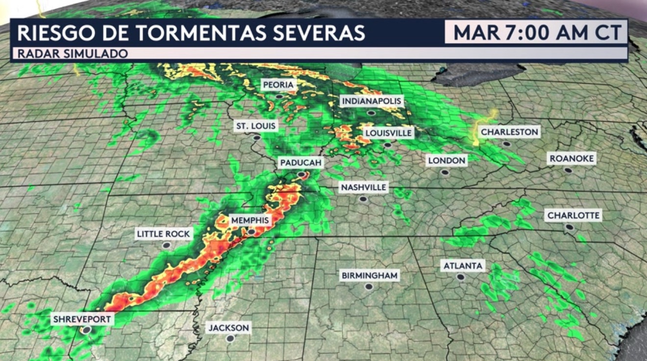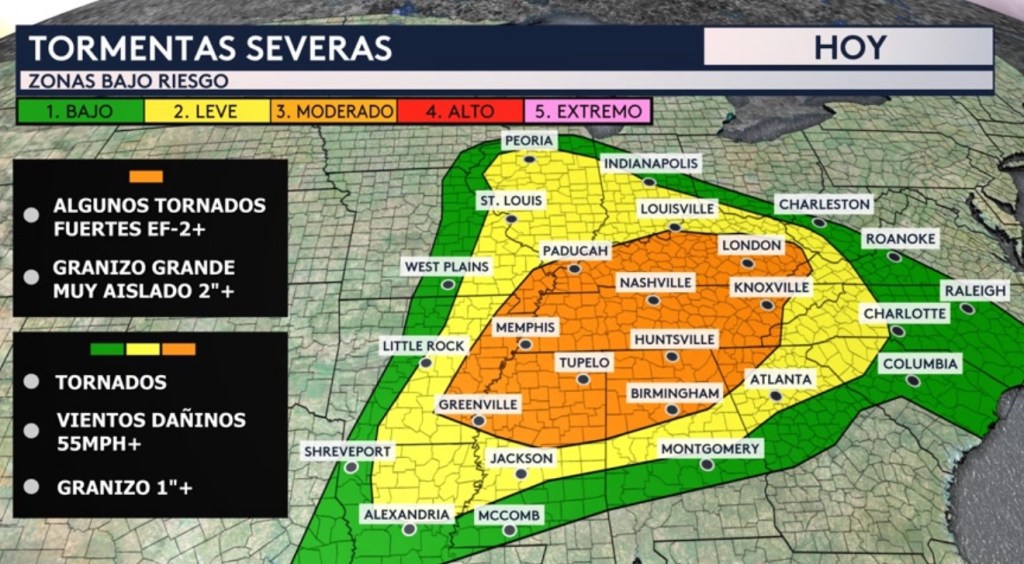 Bajo este riesgo moderado (nivel 3 de 5 en la escala de severidad) hoy incluye Memphis, Nashville, Knoxville y Chattanooga en Tennessee; Huntsville y Birmingham en Alabama; Tupelo y Greenville en Mississippi; Paducah, Bowling Green y London en Kentucky. Recuerda que el sur de Kentucky que incluye ciudades como Somerset y London todavía están en fases de recuperación después de ser afectados por un tornado destructivo el viernes pasado.