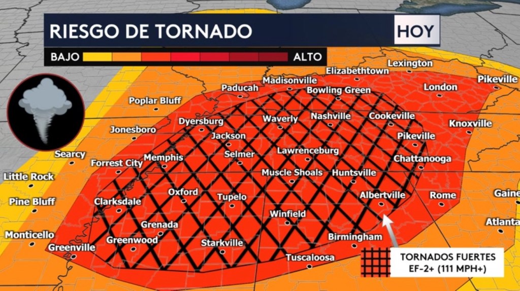 •Nos acercamos a las ciudades que hoy están bajo riesgo de experimentar un tornado fuerte de categoría EF-2 o mayor, lo que se refiere específicamente a la zona sombreada con las rayas negras. Incluye los estados de Alabama, Mississippi, Georgia, Tennessee, Kentucky y Arkansas. Ciudades que se encuentran bajo riesgo son Memphis, Nashville, Chattanooga, Huntsville, Tupelo, Clarksdale y Bowling Green.