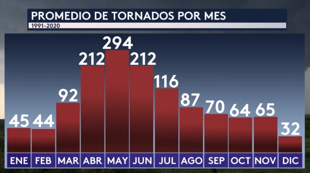 •Si vemos a la frecuencia de tornados por mes en EE. UU., el mes con la mayor cantidad de tornados climatológicamente es mayo. Lo que significa que estamos en el pico de la temporada de tornados.