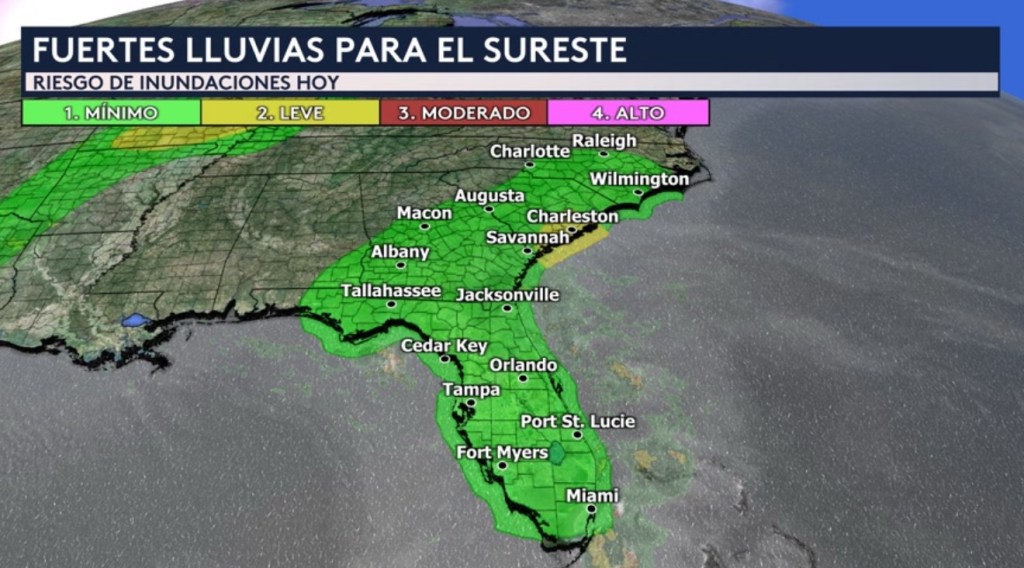 Debido a la presencia de esta perturbación atmosférica, habrá hoy un riesgo de inundaciones repentinas para todo el sureste del país desde Miami en Florida hasta Raleigh en Carolina del Norte. También incluye ciudades como Orlando, Tampa, Jacksonville, Savannah, Augusta, Charleston y Charlotte. Charleston en Carolina del Sur está bajo un riesgo leve (nivel 2 de 4 en la escala de inundaciones).