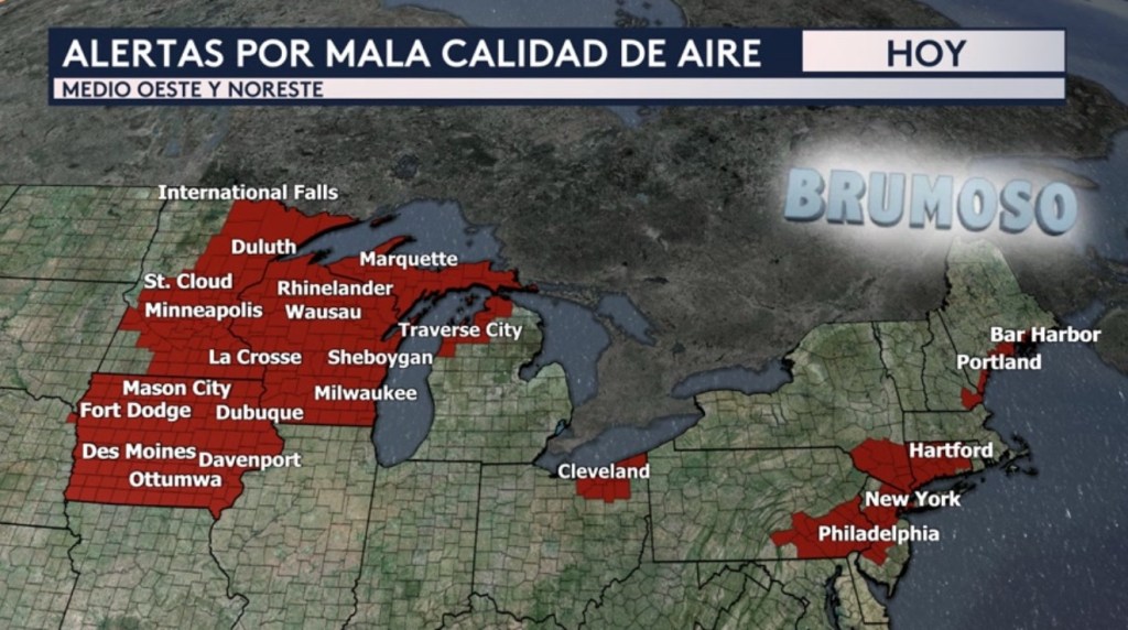 •Hay alertas por mala calidad de aire en vigor para el Medio Oeste y partes de los Grandes Lagos y noreste del país debido a la gran cobertura de este humo de incendio forestal. Incluye ciudades como Minneapolis, Des Moines, Milwaukee, Cleveland, Philadelphia y Nueva York. Las personas con problemas o enfermedades respiratorias deben tomar mucha precaución y limitar su tiempo al aire libre.