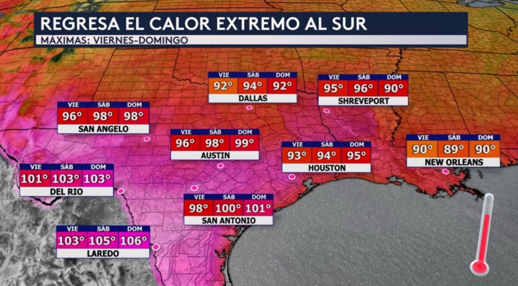 •El calor extremo regresará para el sur del país y especialmente para Texas este fin de semana. San Antonio volverá a experimentar temperaturas máximas en los tres dígitos a partir del sábado mientras que Houston y Dallas en Texas y Shreveport en Louisiana llegan al rango mediados de los 90°. Austin y San Angelo estarán a punto de llegar a los tres dígitos. Laredo en el Valle del Río Grande estará alcanzando los 106° el domingo.