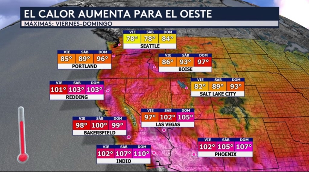 •El calor no solo estará aumentando aquí este fin de semana sino también a través del oeste del país. Portland, Boise y Salt Lake City estarán acercándose y superando los 90° el sábado y domingo mientras que Indio en el sur de California llega a los 110°. Las Vegas regresará a los tres dígitos a partir del sábado. Seattle superará los 80° el domingo.