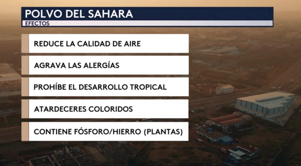 •Aquí están mostrados los efectos tanto positivos como negativos del polvo de Sahara. Reduce la calidad de aire, agrava las alergias y afecta a las personas vulnerables y/o con problemas respiratorios, prohíbe el desarrollo ciclónico debido a la estabilidad que trae esta masa de aire a la columna atmosférica, resulta en atardeceres/amaneceres coloridos (al igual que vimos en Fort Lauderdale esta mañana) y ayuda a las plantas ya que contiene fósforo y hierro.
