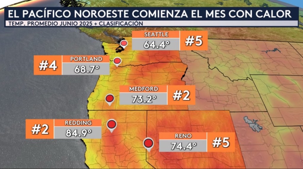 •Reno no es la única ciudad que está experimentado unos de los comienzos de junio más calurosos en los registros sino también a través del resto del Pacífico Noroeste que incluye Redding en California, Medford y Portland en Oregón y Seattle en Washington. Redding y Medford están experimentando el segundo comienzo de junio más caliente.