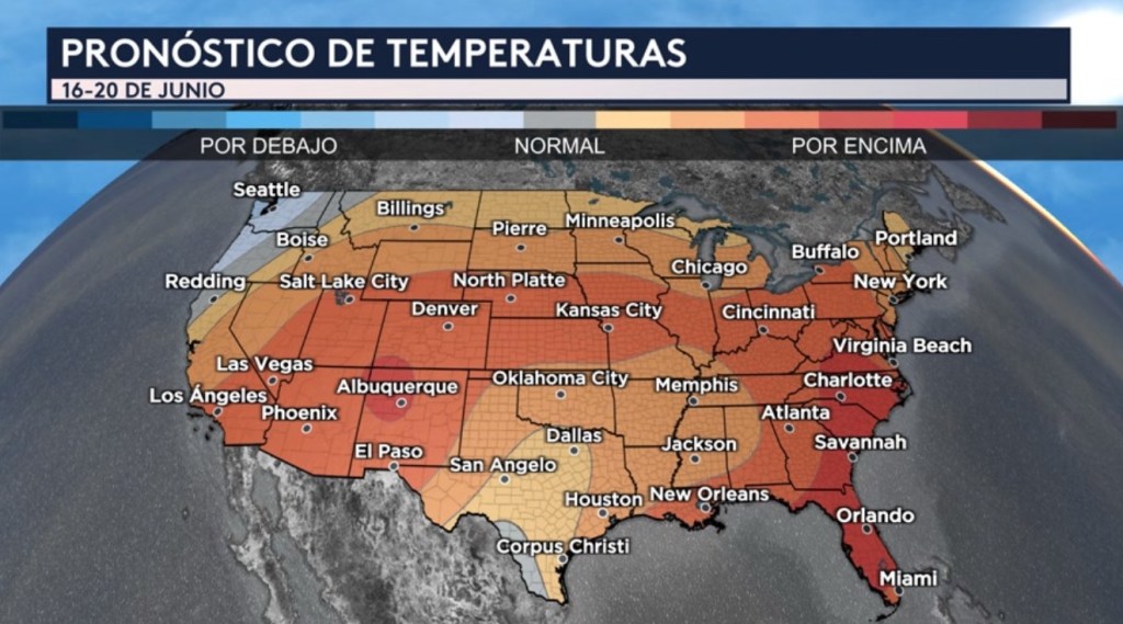 •Si vemos al pronóstico de temperaturas a través de los Estados Unidos para la semana entrante (específicamente entre el 16 y 20 de junio), el calor seguirá dominando gran parte del país. Solamente una pequeña parte del Pacífico Noroeste que incluye la ciudad de Seattle es donde pudiéramos tener temperaturas un poco por debajo del promedio.