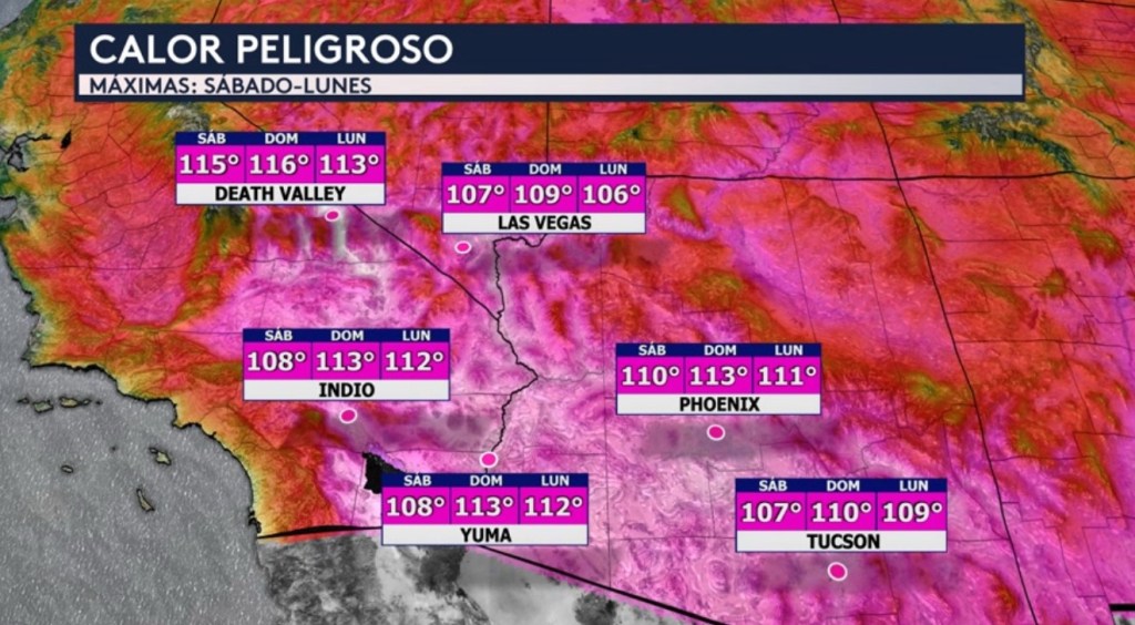•Vemos como las temperaturas máximas sobre el sur de Arizona, sur de Nevada y el interior de California estarán superando los 110° este fin de semana cuando la alerta por calor extremo esté en vigor. Esto será un calor peligroso que afectará a cualquier persona con una exposición prolongada sin las medidas de precaución.