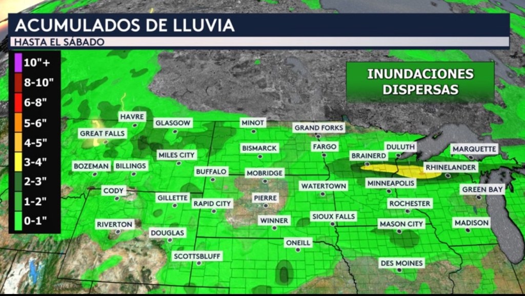 La perturbación al norte estará produciendo acumulados de lluvia de hasta 3 pulgadas desde Montana hasta Wisconsin pero vemos como habrá un franja de totales más altos sobre el norte de Minnesota y Wisconsin de más de 3 pulgadas. Como resultado, se esperan inundaciones repentinas dispersas a través del norte de las Montañas Rocosas, el norte de las planicies y el Medio Oeste Superior desde hoy hasta el sábado tras el paso de este disturbio.