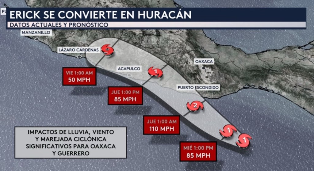 •Erick a esta hora de la mañana se sigue organizando según las imágenes más recientes de radar. Si vemos el cono de trayectoria, Erick seguirá su desplazamiento al noroeste durante el día hoy, probablemente ganando intensidad rápidamente. Se pronostica hasta el momento que Erick llegue a ser un huracán de categoría 2 con vientos máximos sostenidos de 110 mph, pero no se descarta que sea categoría 3 (ya que algunos de los modelos de pronóstico lo muestra con vientos sostenidos de entre 110-120 mph) a medida que se acerque a la costa de Oaxaca o Guerrero el jueves temprano por la mañana. Se esperan impactos de lluvia, viento y marejada ciclónica significativos para los estados de Oaxaca y Guerrero.