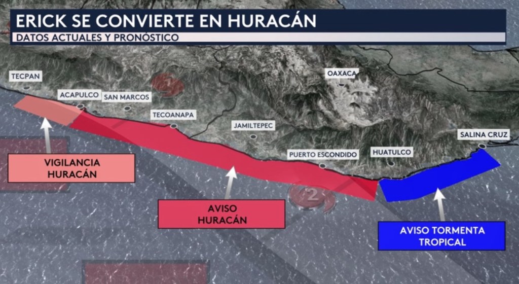 Hay una vigilancia de huracán (donde las condiciones de huracán son POSIBLES dentro de las próximas 48 horas) al oeste de Acapulco hasta Tecpan de Galeana en Guerrero.
