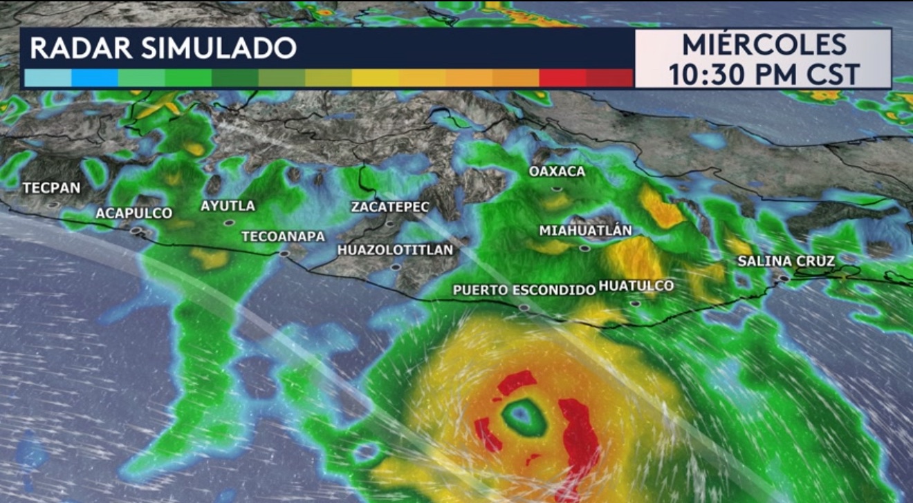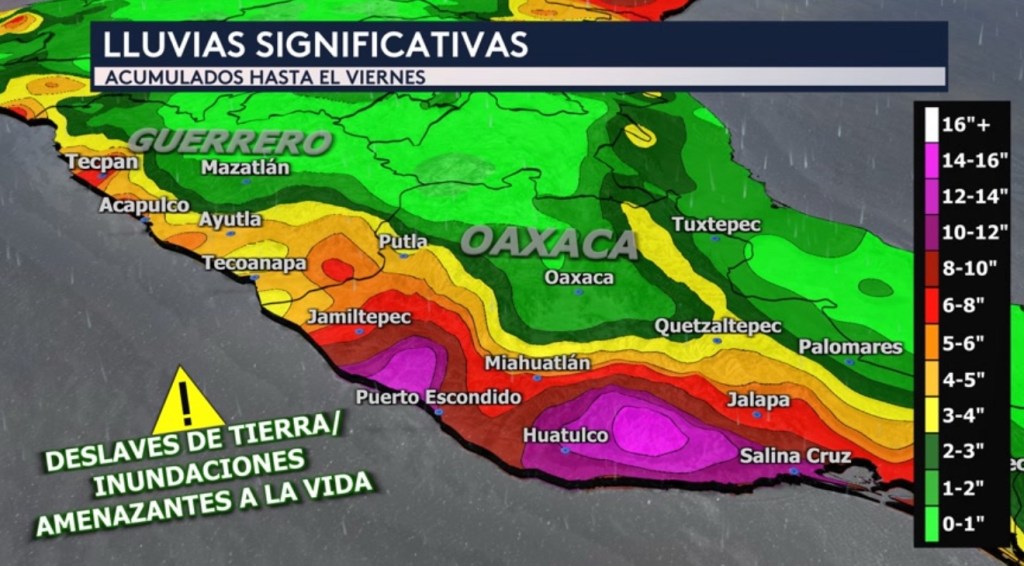 •Estamos pronosticando lluvias significativas para México tras el paso de este peligroso huracán, especialmente para los estados de Oaxaca y Guerrero. Nuestro modelo de pronóstico nos está mostrando acumulados de lluvia de hasta 16 pulgadas en el estado de Oaxaca entre hoy y el viernes. En Guerrero, se pronostican acumulados entre 3 a 5 pulgadas con totales aislados más altos de más de 6 pulgadas posibles. Esto será problemático debido al terreno montañoso de México, donde esta fuerte actividad de lluvia probablemente provocará deslaves de tierra e inundaciones repentinas amenazantes a la vida.