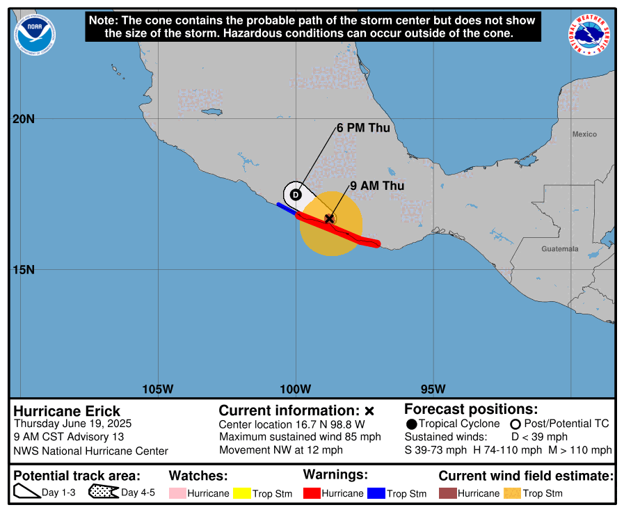 •En la información más reciente del Centro Nacional de Huracanes 11:00am EDT / 9:00am CST (1500 UTC) el Huracán Erick ahora como Categoría 1 se localizó en los 16.7 °Norte y 98.8 °Oeste posición que lo situaba a 30 millas / 50 kilómetros al Norte-Noroeste de Punta Maldonado, México con vientos máximos sostenidos de 85 millas por hora / 140 kilómetros por hora presión mínima central de 980 mb mientras se mueve al Noroeste a 12 millas por hora / 19 kilómetros por hora. Se espera que Erick continúe moviéndose tierra adentro sobre el sur y suroeste de México siendo el peligro principal las lluvias e inundaciones con potencial de ocasionar deslizamientos de tierra amenazantes para la vida. Se pronostica que Erick se disipe en la noche de este jueves.