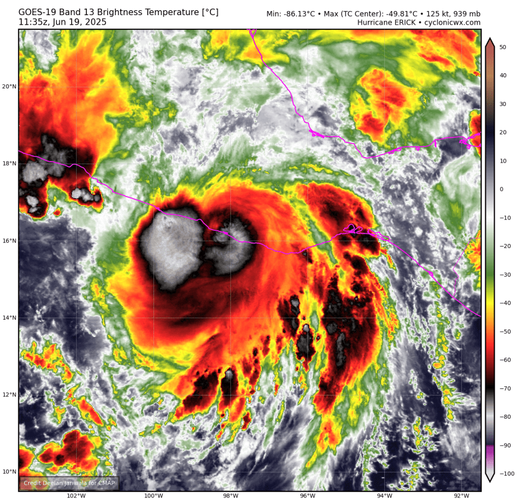 •Como habíamos advertido el Huracán Erick se intensificó más de lo esperado en su acercamiento al sur de México y azotó fuertemente la zona occidental de Oaxaca y oriental de Guerrero en la madrugada y la mañana de este jueves 19 de junio del 2025