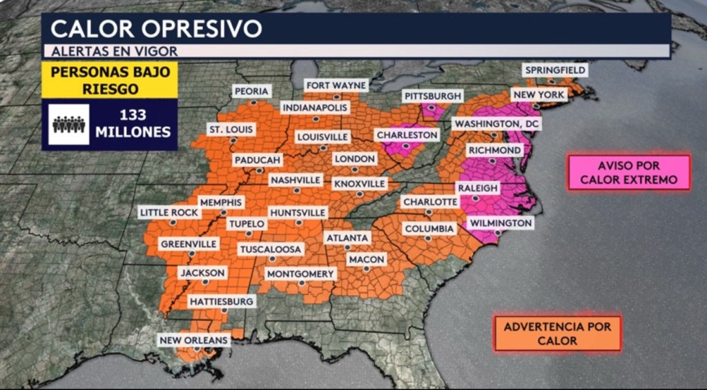 •A esta hora 133 millones de estadounidenses siguen bajo algún tipo de alerta por el calor excesivo desde la costa del golfo hacia el norte hasta el Valle de Ohio y partes del noreste. Ciudades como Filadelfia, Pittsburgh, Charleston, Richmond, Raleigh y Wilmington se encuentran bajo un aviso por calor extremo mientras que Nueva York, Washington DC, Nashville, Atlanta, Charlotte, Huntsville, New Orleans, San Luis, Indianapolis y Louisville están bajo una advertencia por calor.